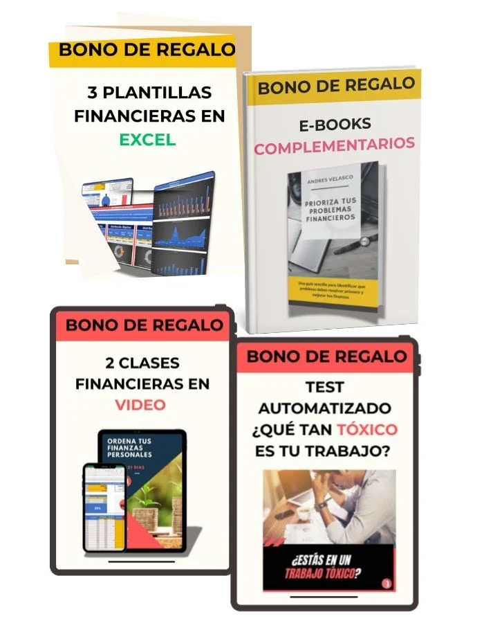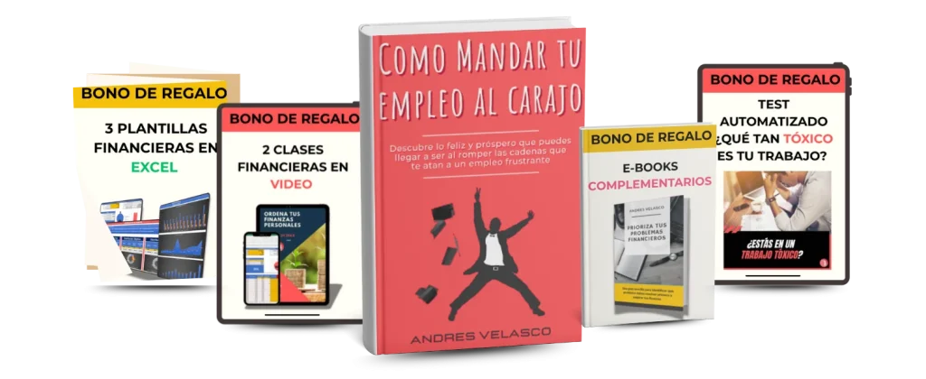 e-books sobre temas laborales y otros 2 sobre finanzas personales, para que complementes los conocimientos que adquirirás con COMO MANDAR TU EMPLEO AL CARAJO.